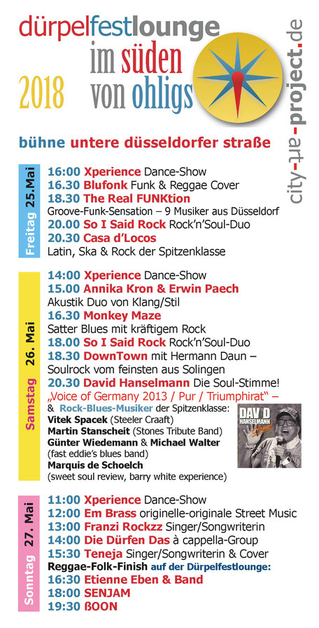 Am 27.05.2018 ab 11:00Uhr geht es mit dem Programm und mächtig guten Bands los bis dann ab 16:30Uhr die ultimative Reggae-Folk-Finish-Dürpel-Abschluss-Party auf der Dürpelfestlounge – Untere Düsseldorfer Straße, Solingen stattfindet. Wir freuen uns schon jetzt auf das Fest, ganz besonders auf Senjam ab 18:00Uhr und natürlich haben wir MEGA Lust mit Euch ab 19:30Uhr den ßoon Gig abzufeiern. Weitere Info´s zum Fest findet Ihr unter folgendem Link zum City-Art-Projekt. Bis zum 27.05.2018…………….
